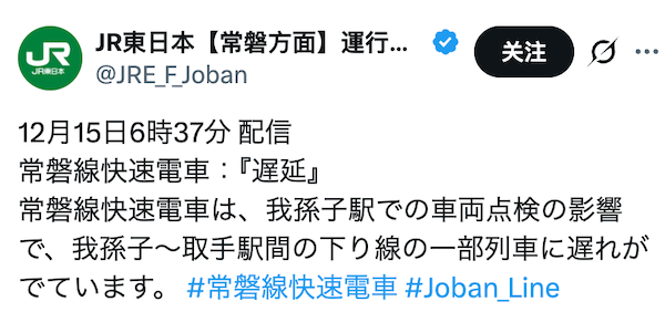 司机睡过头导致日本首趟JR常磐线列车晚点24分钟