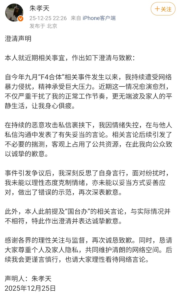 12月25日晚,朱孝天在社交媒体上发表道歉声明:自今年9月发生“F4 Fusion”相关事件以来,本人不断受到网络暴力骚扰,承受着严重的精神压力。这种情况最近愈演愈烈,不仅严重打乱了我正常的工作节奏,而且无端影响了家人的平静生活,让我身心俱疲。在恶意私信的不断威胁下,我情绪失控,在私信中向他人发表不当言论。有关言论引起不必要的猜测,客观上占用了公共资源。我谨向公众致以诚挚的歉意。引起争议的事件发生后,我深刻反省自己的言行。当面对混乱时,我无法以理性的态度控制自己的情绪,无法做出适当的反应。我树立了错误的榜样,并再次 si诚挚地道歉。另外,我刚才有关“国台办”的言论也不符合实际情况。我特此作出澄清并表示诚挚的歉意。感谢社会各界的合理关注和监督,再次诚挚致歉。同时,我们也要求大家尊重个人及其家人的隐私,共同维护干净的网络空间。今后我会更加谨言慎行,也请大家理性看待网上评论。 12月25日,艺人朱啸天向粉丝群发布公告称,他已实名举报五月天经纪公司“相信音乐”多次违规行为,并配合相关部门完成调查。他的报告内容包括与黄牛勾结炒选票、转移资金避税、强迫艺术家假唱并在问题上表明立场。在近日在上海举行的演唱会,五月天阿信以替补成员的身份亮相,并在舞台上感谢朱孝天“暂时缺席约会”。对此,朱孝天远程回复粉丝群表示尚未收到任何消息,并表示相关说法“只是说说而已”。编辑:董志杰 编辑:姚乐